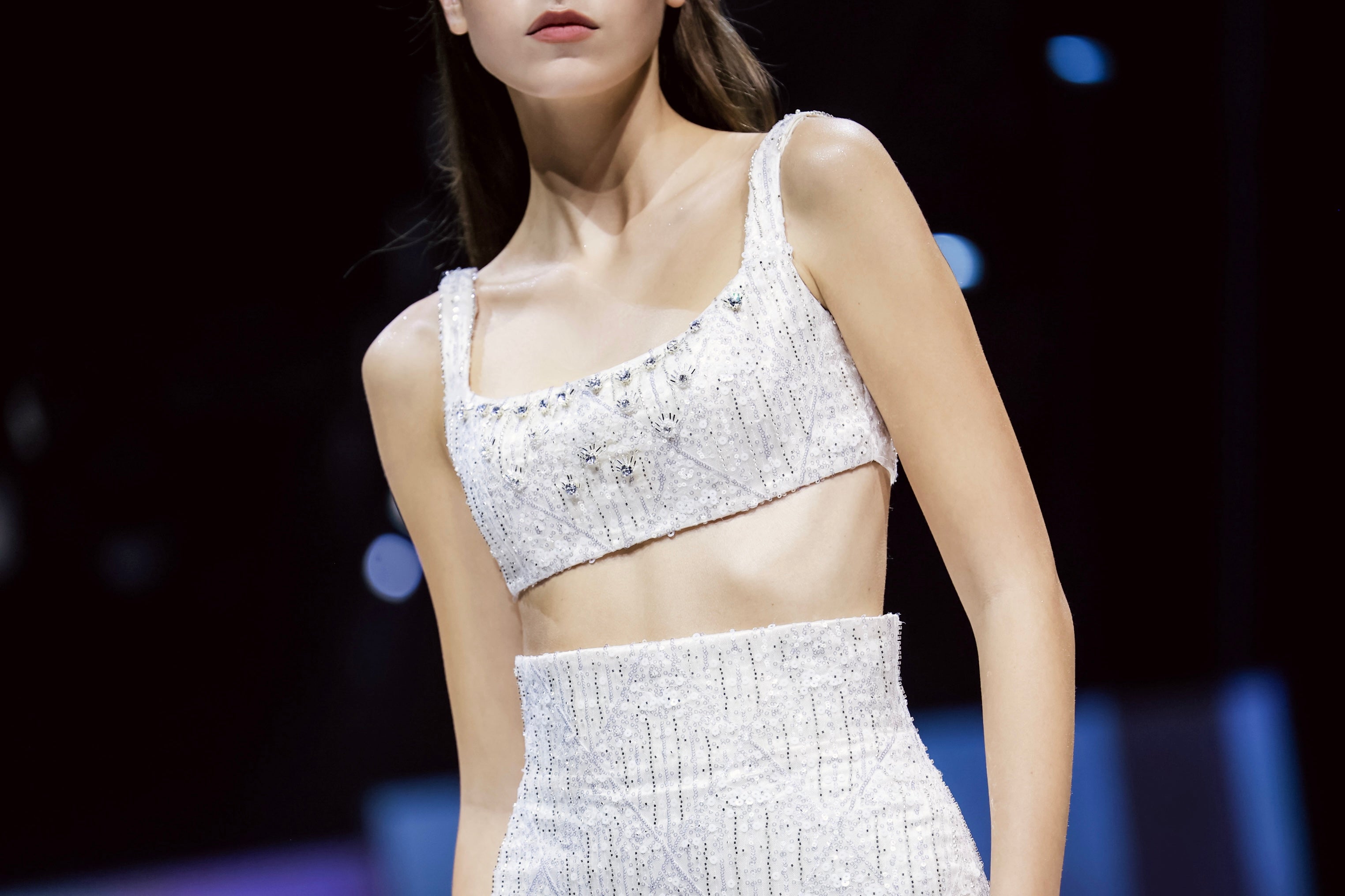 Every stitch whispers of desire. Luxurious ostrich feathers are intricately embroidered, tulles flutter like sighs, and sequins shimmer amidst heavenly pearl tassels. Hand-stitched rhinestones adorn the finest lace, creating a mesmerising dance of texture and light.