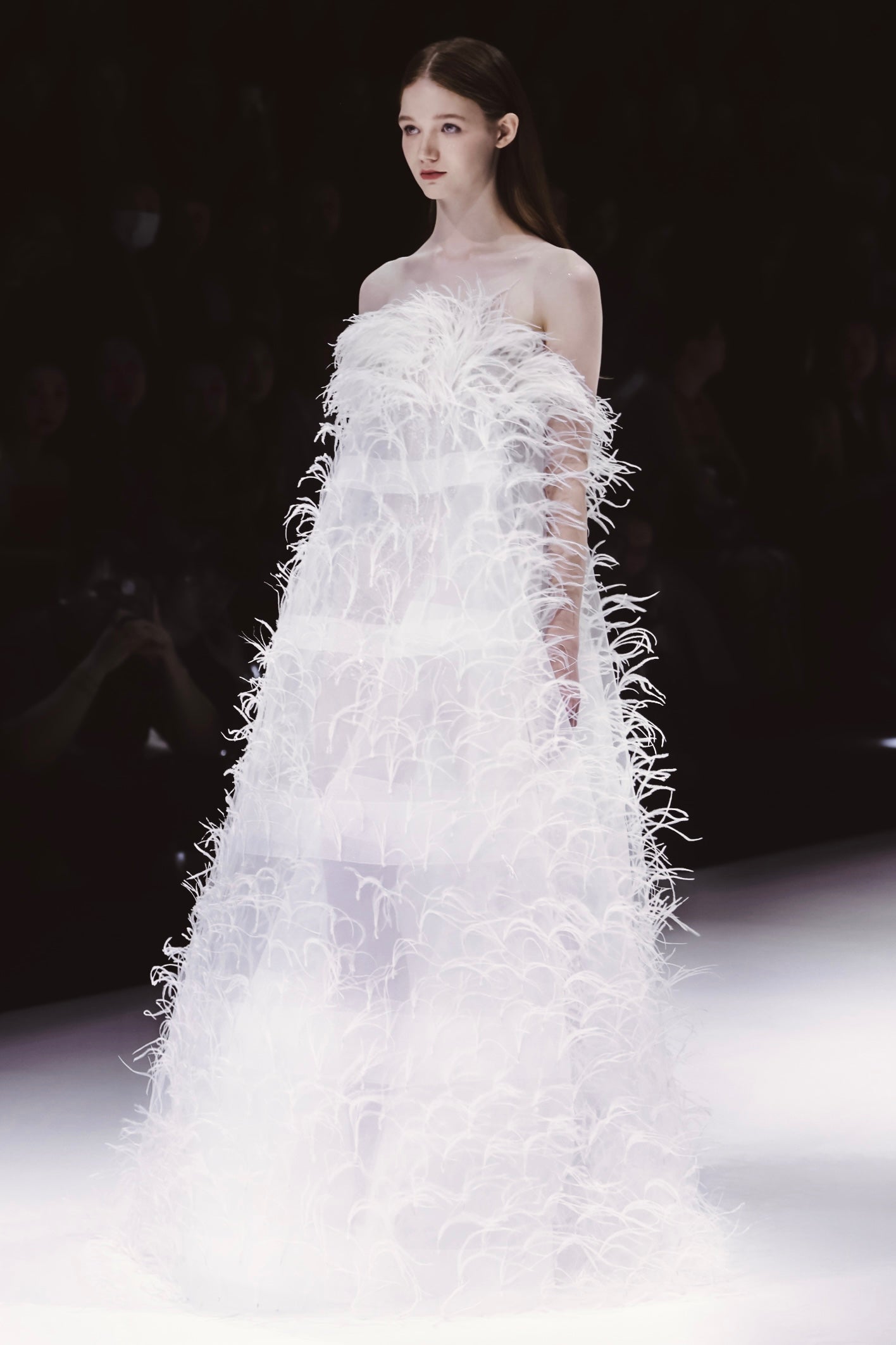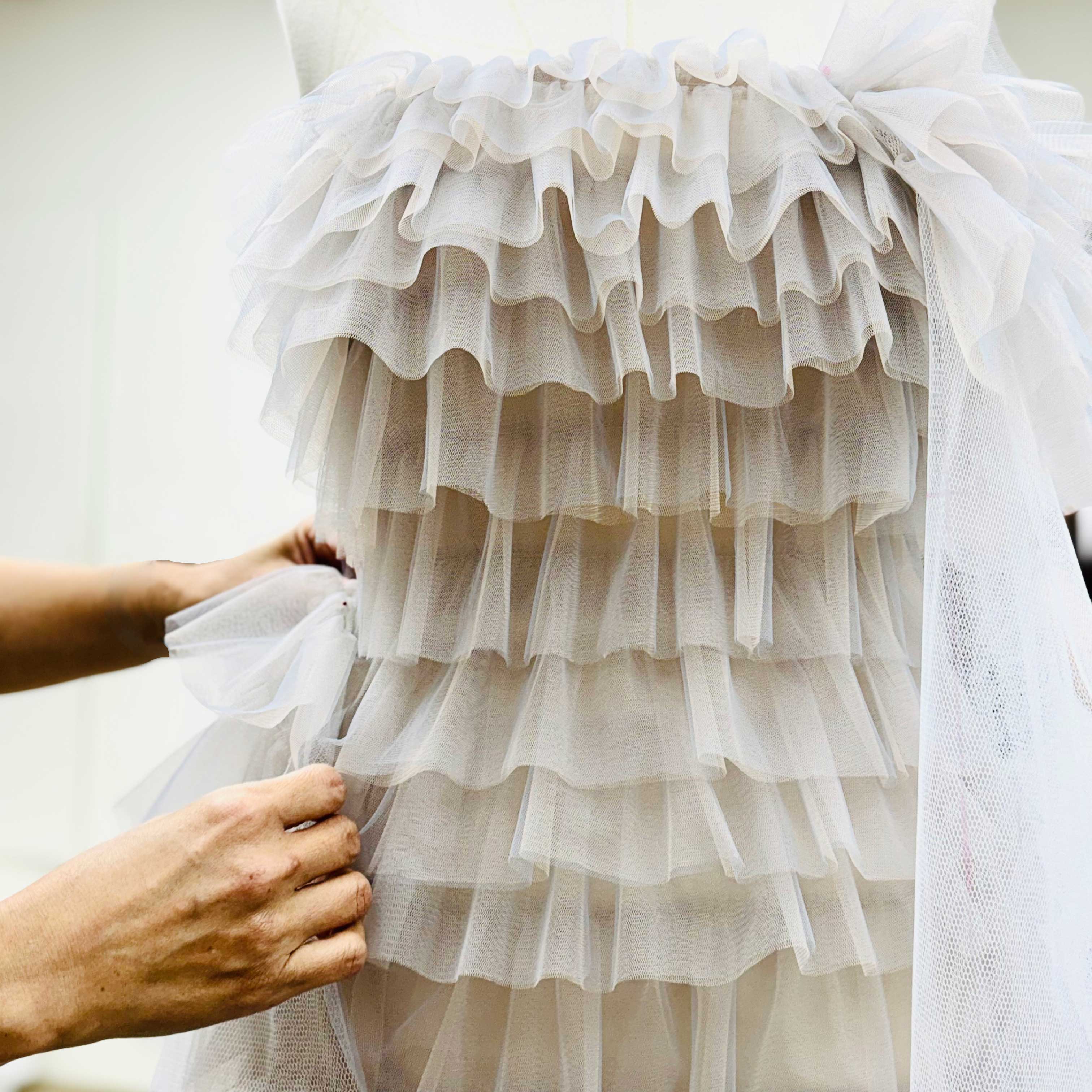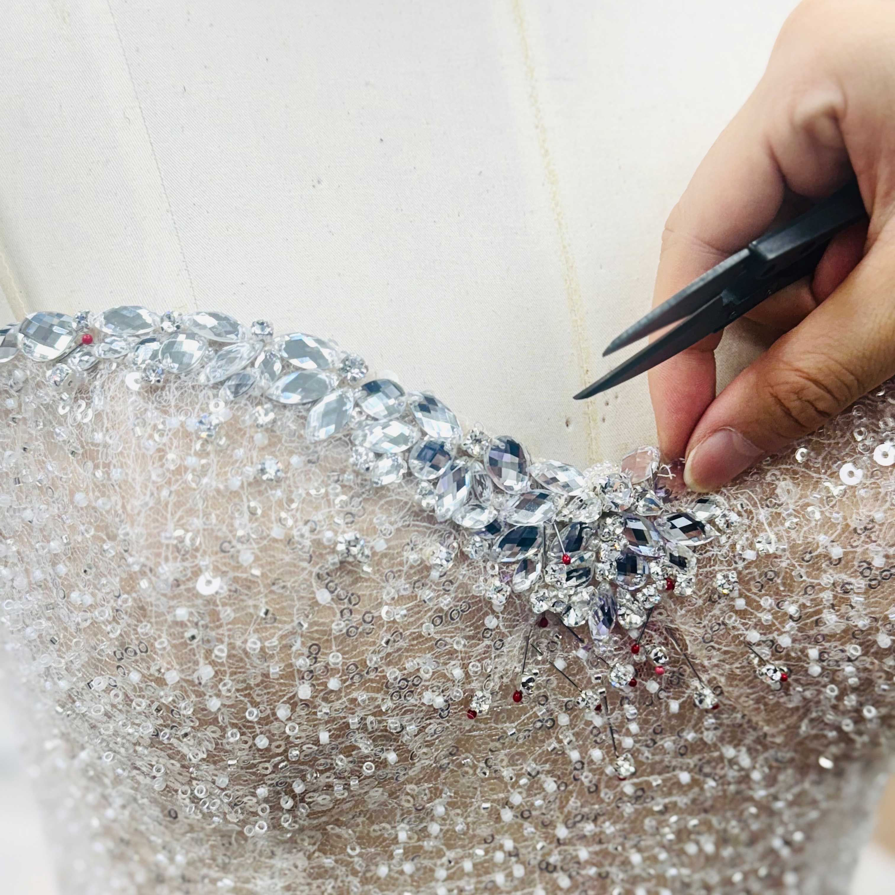 Every stitch whispers of desire. Luxurious ostrich feathers are intricately embroidered, tulles flutter like sighs, and sequins shimmer amidst heavenly pearl tassels. Hand-stitched rhinestones adorn the finest lace, creating a mesmerising dance of texture and light.