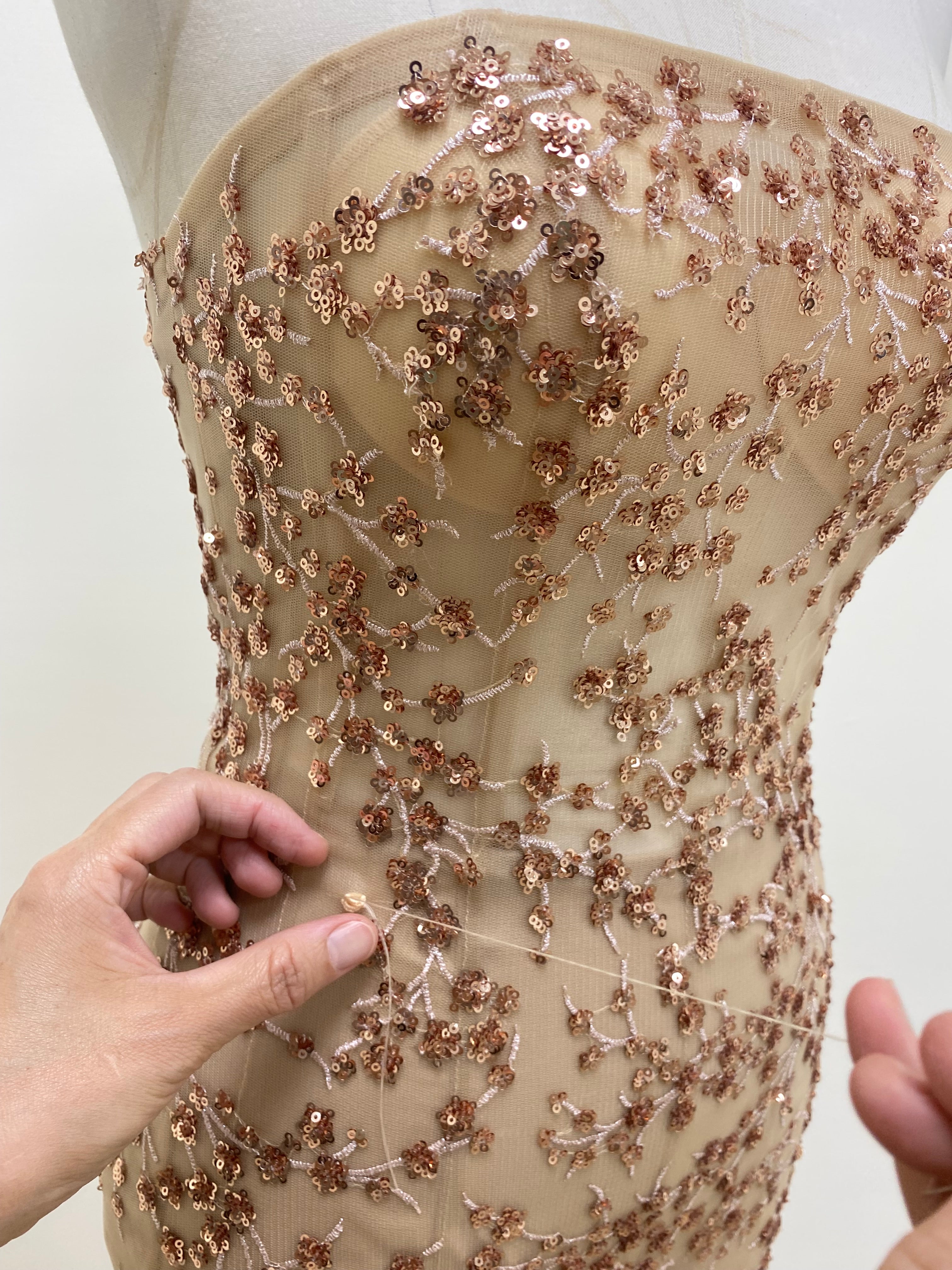 LETOII ATELIER’s “SUNSET & VINE ” collection epitomizes haute couture spirit, employing the finest lace, sequins, and fabrics. Over 6,000 hours of meticulous craftsmanship have yielded romantic, vivid creations. Gowns feature up to 35,000 rhinestones, beads, or 80,000 sequins, depicting wild vines and roses inspired by the ever-changing Tuscan landscape. Golden threads delicately embroider vines on bronze tulle. Layered tulle forms voluminous silhouettes, with pale blue and misty grey tulle crafting soft, abstract three-dimensional roses. Dark wine-red tulle gowns evoke Tuscan romance, each creation magnificently embodying the true spirit of couture romance in this collection.