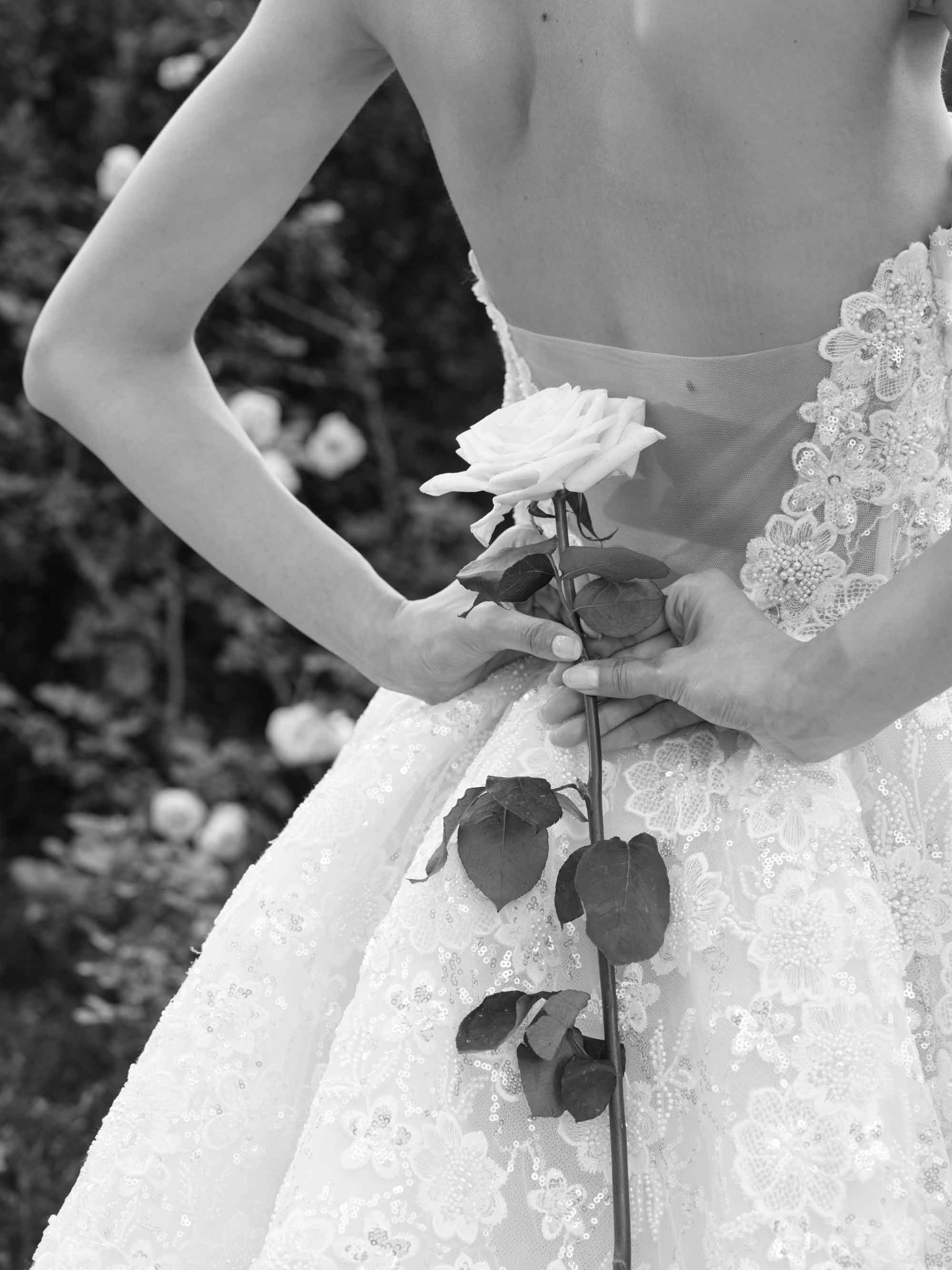 LETOII ATELIER 的「SUNSET & VINE」系列體現了高級時裝精神,採用最優質的蕾絲、亮片和布料。超過 6,000 小時的精心製作,打造出浪漫、生動的作品。禮服上飾有多達 35,000 顆水鑽、珠子或 80,000 顆亮片,描繪了受不斷變化的托斯卡納風景啟發的野生藤蔓和玫瑰。金線在青銅薄紗上精緻地繡出藤蔓。層疊的薄紗形成豐盈的輪廓,淡藍色和霧灰色的薄紗打造出柔和、抽象的立體玫瑰。深酒紅色薄紗禮服喚起托斯卡納浪漫氣息,每件作品都完美體現了該系列中浪漫高級訂製的真正精神。